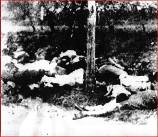 Nelle borgate altri cadaveri, a mucchi, nelle case che bruciano, davanti alle porte, qua e là sulle piane, nei fossi, fra gli alberi: alcuni, sotto le macerie, riceveranno sepoltura dopo un anno e sette mesi. In un viottolo il corpo di una donna, la gonna alzata, il viso coperto di mosche. Accanto, povere cose di tutti giorni: un gomitolo di filo, del riso, una sveglia.[26] E poi carcasse di animali bruciati nelle stalle o abbattuti sui sentieri, dai più grossi a quelli da cortile. Mannelli di grano e paglia dati alle fiamme.