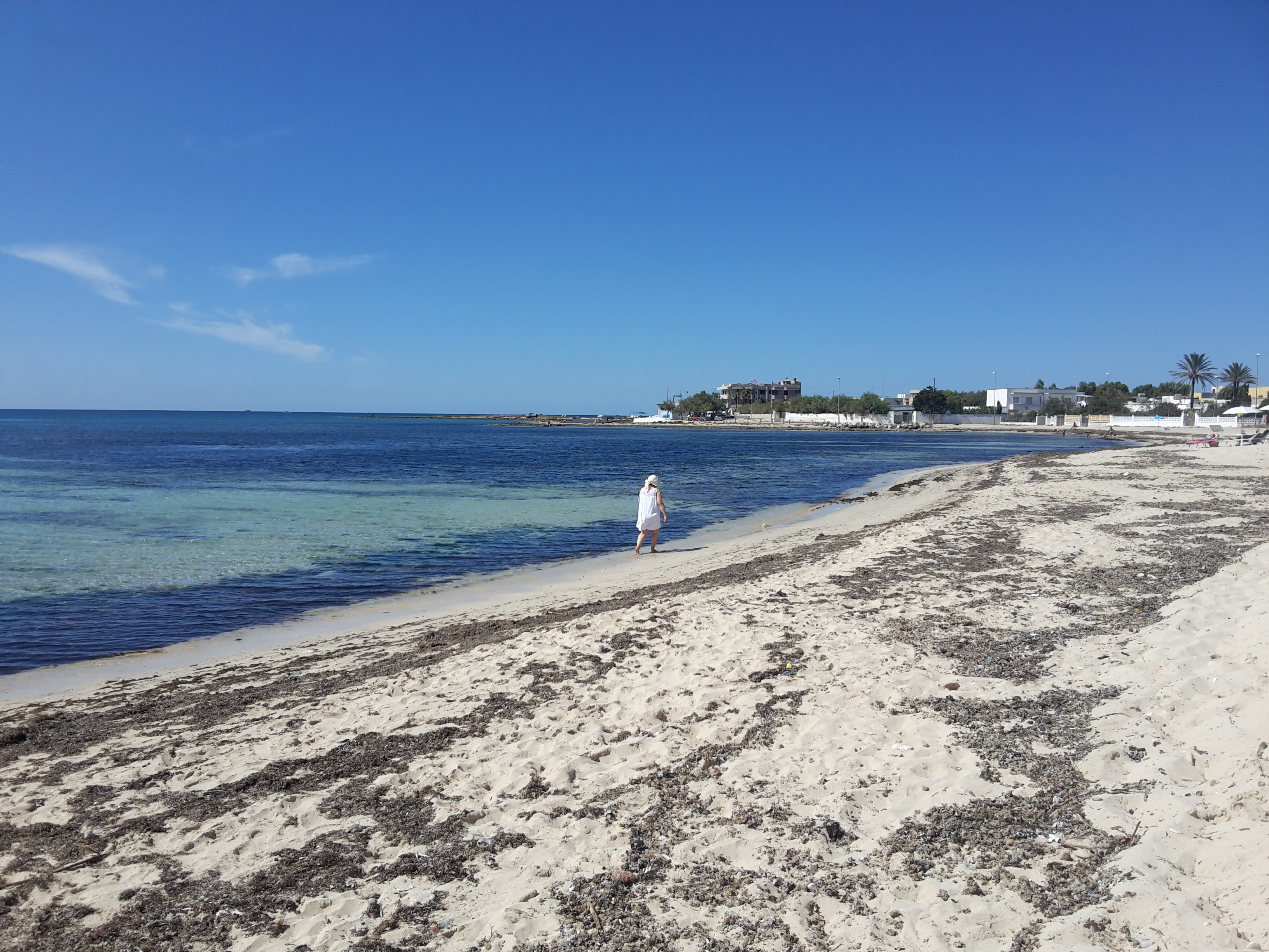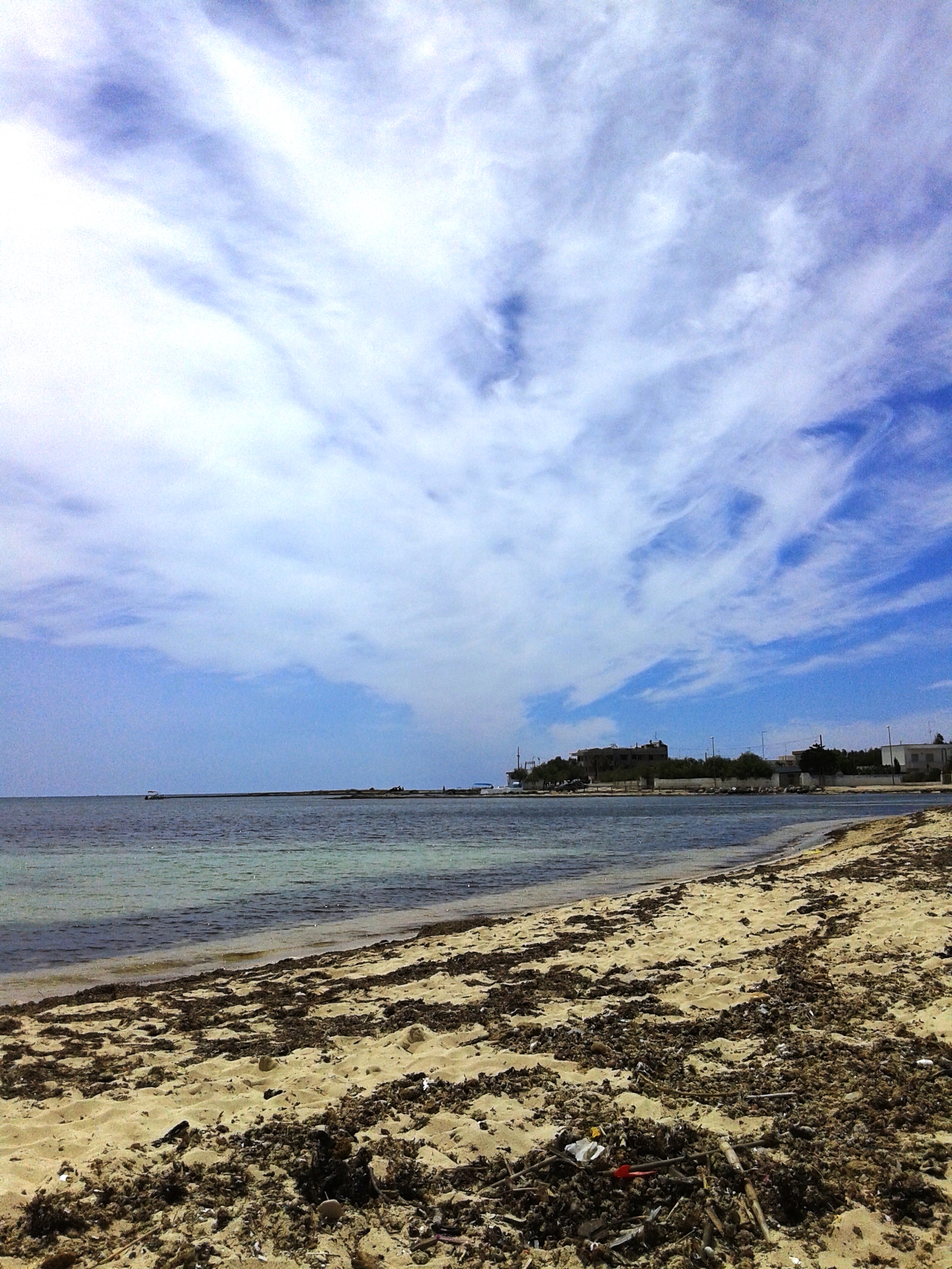 Dalla Sanzara, per arrivare sono circa dieci minuti di macchina fra uliveti, campi e pascoli. L’unica struttura alta (e brutta) sono due silos all’apparenza abbandonati, che ricordano un po’ la serie postapocalittica Wool di Hugh Howey, ma li lascio velocemente alle spalle. La cittadina di Torre Lapillo è assolata e un po’ decadente, strutture di legno che promettono di diventare fatiscenti, colori qua e là scrostati, rifiuti. Ma a me interessano la spiaggia e il mare. Quello che scelgo è un tratto un po’ selvaggio, lontano dalle strutture balneari, dove non c’è praticamente nessuno. La sabbia è bianchissima e non grigia e polverosa come da noi in Versilia, il mare è calmo, trasparente come un cristallo azzurro.