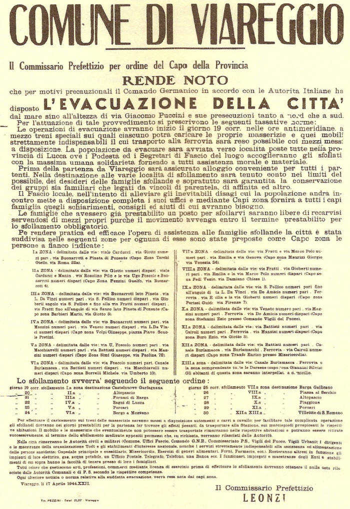 “Si correva tutti in pineta… non c’erano rifugi, niente. Poi, quando siamo sfollati in campagna, ce li costruivamo da noi: un buco nel monte, chiuso con delle travi. ” [Antonio Checchi, viareggino]. La città è completamente sfollata dall’aprile.[26]