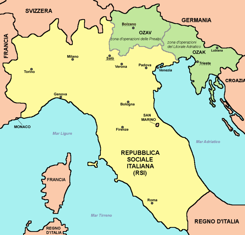 L’Italia è territorialmente e militarmente divisa in due parti: a Sud il governo Badoglio (e la famiglia reale) nelle mani degli Alleati, a Nord la Repubblica di Salò, governo fantoccio di Benito Mussolini, agli ordini dei tedeschi di Hitler.