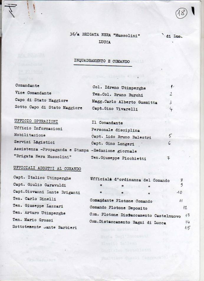Visto il fuggi fuggi generale, Alessandro Pavolini[32] convoca Idreno Utimperghe(r)[33] per rinvigorire il fascismo lucchese, e da Milano lo sposta a Lucca nominandolo Commissario Federale al posto di Olivieri; Pavolini consegna le armi agli iscritti del Partito Fascista Repubblicano di Lucca[34], costituendo di fatto la prima Brigata Nera affidando il comando a Utimpergher: la 36° Brigata Nera “Mussolini”[35] in cui confluiscono anche i gruppi dei Fascisti Armati chiamati “Compagnie della Morte” o “Mai Morti” e che arriverà a contare circa 160 uomini. Il compito è “distruggere la piaga del ribellismo” e di assicurare la tranquillità delle retrovie germaniche.[36] La Brigata Mussolini inizia le sue attività repressive sia con azioni indipendenti[37] sia fiancheggiando le truppe naziste[38]. «alcune Brigate nere – soprattutto la “Mussolini” di Idreno Utimpergher a Lucca – mostreranno una straordinaria capacità di iniziativa, sul terreno della repressione, tentando di fare sino all’ultimo dell’occupazione tedesca una propria occasione di vendetta»[39] . Esiste la documentazione dell’organico (probabilmente incompleto) della Brigata al 14 agosto ’44[40], in cui troviamo: