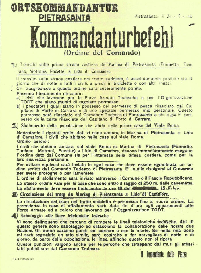 A partire dal 30 giugno 1944[1] viene emanata una serie di ordinanze di sfollamento con le quali si costringe tutta la popolazione ad abbandonare il territorio per evitare intralci alle manovre e per eliminare le fonti di approvvigionamento ai partigiani[2]. Forte dei Marmi viene sfollata il 1 luglio in otto ore. Nel giro di qualche settimana, stessa cosa accade per i comuni di Seravezza, Pietrasanta e Stazzema (il giorno 5 luglio, l’ordine riguarda la zona che da Strettoia va fino a Cinquale).