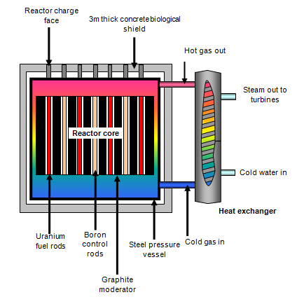 Durante il ciclo di funzionamento, il combustibile uranio si riscalda. Il calore viene “catturato” da acqua pompata sotto pressione che si trasforma in vapore, il quale aziona turbine dotate di generatori elettrici. Il vapore viene successivamente ricondensato in acqua.