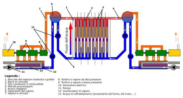 - Sistema di refrigerazione: è costituito da due circuiti indipendenti, attivi in parallelo, ciascuno in grado di raffreddare una metà del nocciolo. L’acqua ha funzione solo di refrigerante (non anche di moderatore come nel caso dei reattori PWR o BWR): in caso mancanza della stessa, per black out elettrico o altri motivi, la potenza del reattore invece che azzerarsi si impenna fino a conseguenze estreme.