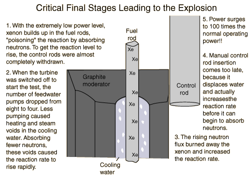 La potenza, invece di arrestarsi al 30%, scende all’1% (200 MWt). Si cerca di ripristinare velocemente i valori utili per il test, ma la presenza di xenon impedisce di superare il livello del 12%. Vengono sollevate tutte le barre di controllo tranne sei, in completa violazione delle procedure che ne prevedono un minimo di trenta (secondo errore); sono azionate altre due pompe per il raffreddamento di sicurezza del nocciolo, ma a queste condizioni il nocciolo e le pompe sono attraversati da portate d’acqua eccedenti i limiti previsti dalle norme di esercizio (terzo errore). Il nocciolo dell’RBMK si riempie d’acqua e vapore, diventando sempre più instabile. Il coefficente di vuoto diventa positivo.