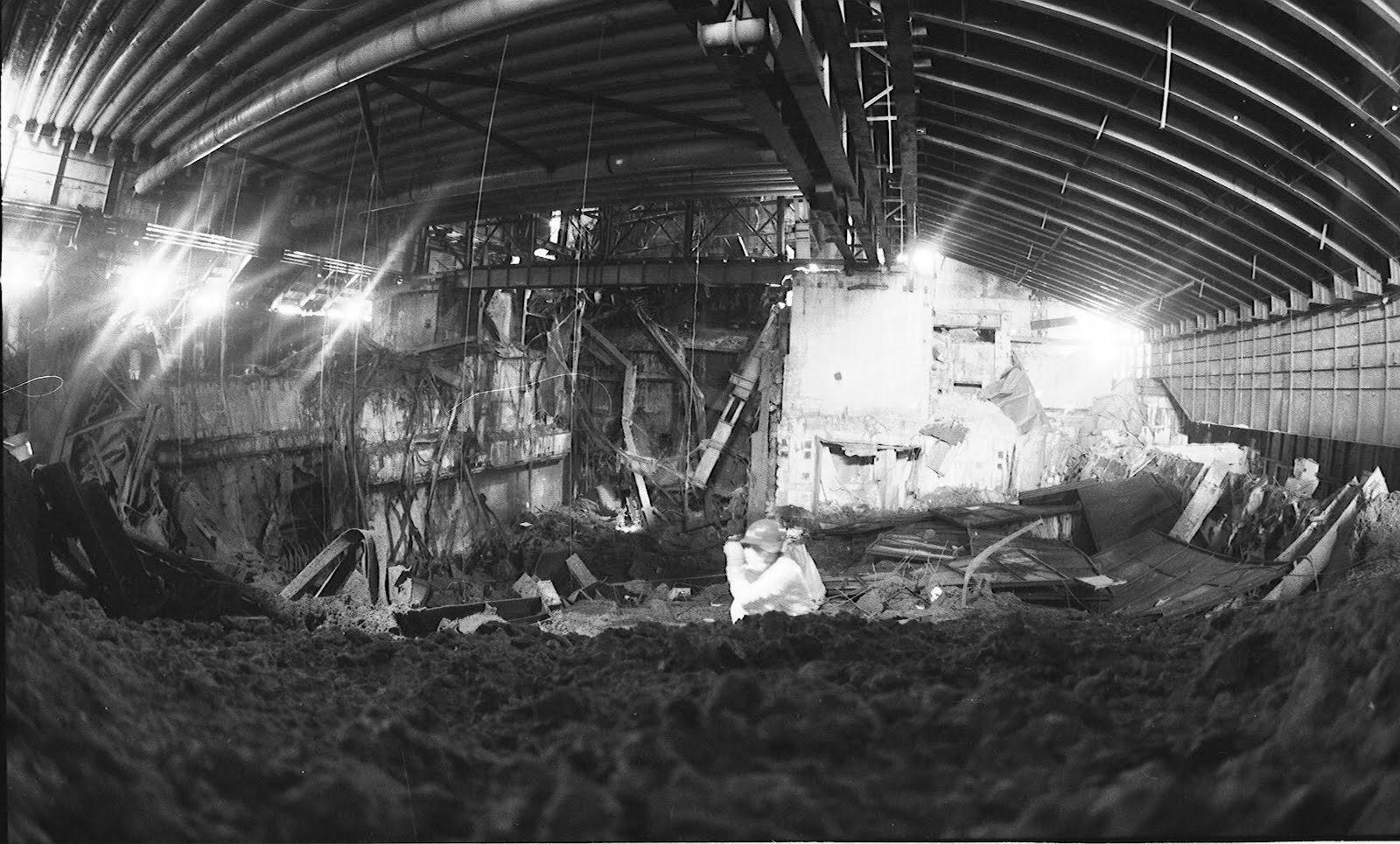 Fu deciso di coprire il ground zero con un sarcofago di cemento e metallo, per limitare al massimo le emissioni, mentre un’apposita spedizione di scienziati, coadiuvata dall’esercito dell’Armata Rossa e da robot-scavatori, cercava di localizzare il residuo di nocciolo ancora attivo. I robot vennero presto sostituiti da “bio-robot” (umani), perchè il livello di radiazione rendeva impossibile l’uso di macchinari.