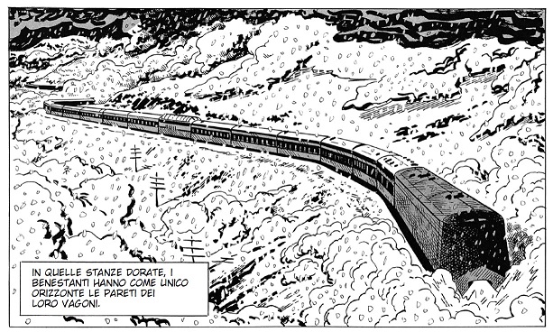 Raccontare una storia in un sistema chiuso trova nello schema-treno un’ambientazione ideale: la forzata staticità “dentro” è contrapposta al moto perpetuo nel “fuori”, la quest del protagonista viene scandita dal succedersi dei vagoni e le prove da superare sono le porte da varcare: quali mostruosità (nel senso anche di meraviglia) possono svelare? L’atmosfera del fumetto è quella di una triste fiaba invernale, in cui il bianco e nero usato per i disegni aumenta il senso di gelo.