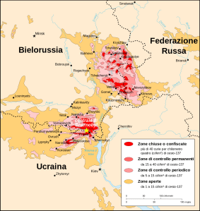 “La Zona”, come viene abitualmente chiamata – inizialmente un’area circolare di 2800 m2 allargata poi a 4300– aveva per epicentro il luogo dell’esplosione ed è stata succesivamente divisa in anelli concentrici proporzionali al grado di contaminazione. Nel 1996, dieci anni dopo, i suoi confini interessavano zone più ampie e la gestione è stata assunta dal Servizio di Stato di Emergenza: