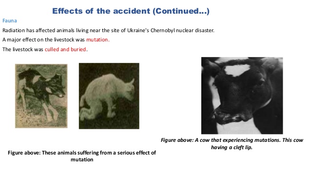 Rondini con tracce di albinismo, puledri le cui zampe si biforcano sotto le ginocchia, maiali senza occhi e vitelli a due teste (slide 11) sono stati le espressioni più eclatanti, ma non sempre l’immediata evidenza costituisce il problema principale: se alcuni scienziati scorgono una positiva rinascita di questo luogo in cui l’uomo non è più la specie dominante, altri sospettano che la vera eredità di Chernobyl sia ancora da svelare.